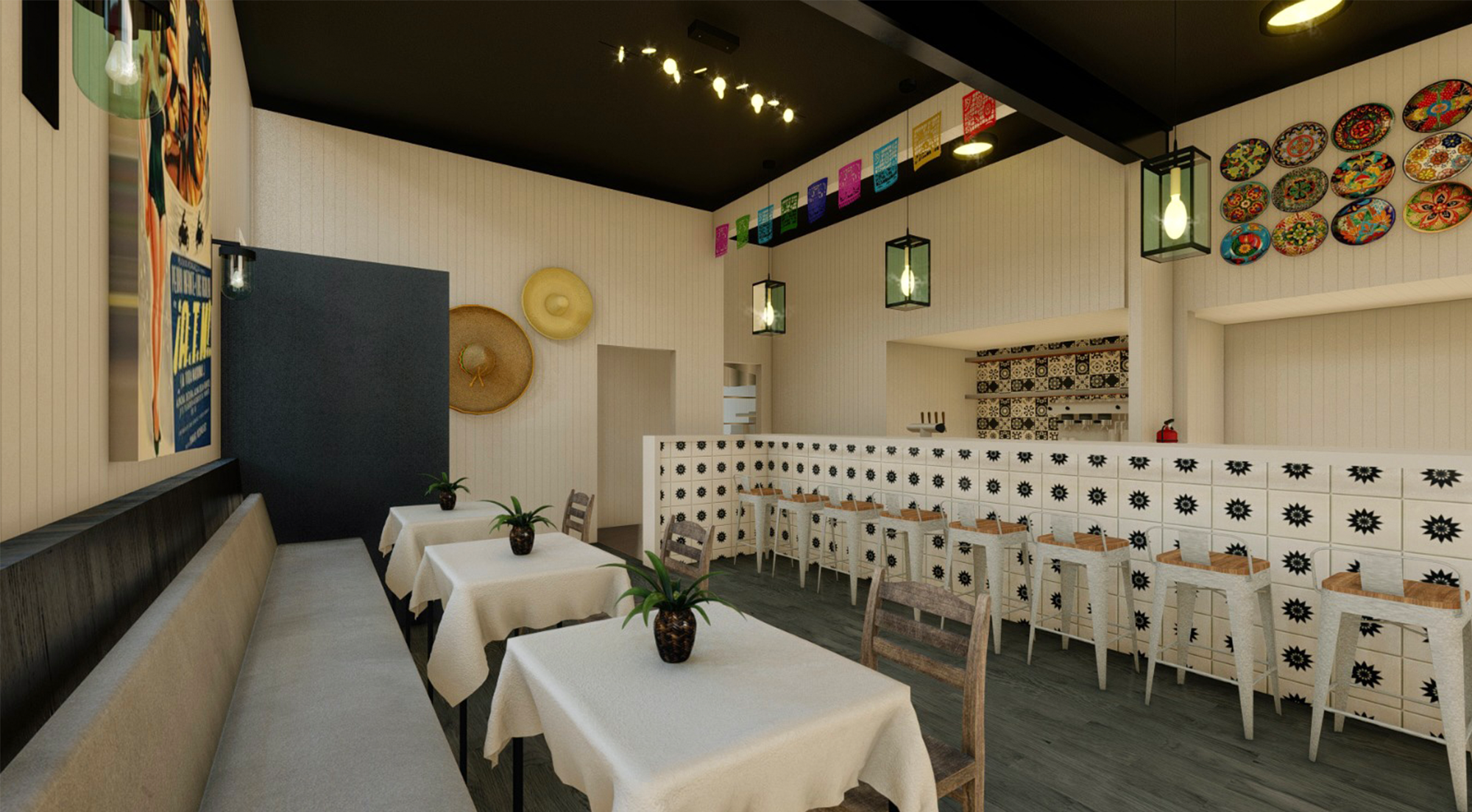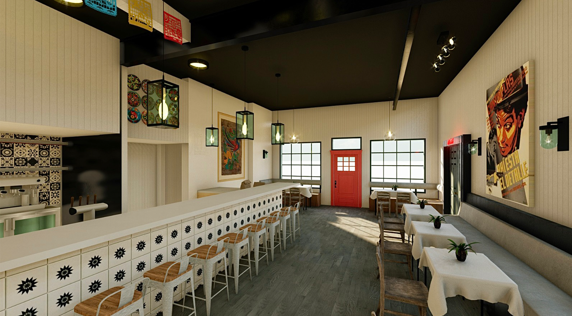 This restaurant interior blends Mexican influences with a laid-back Los Angeles feel. Custom tilework, vintage posters, and papel picado details create an atmosphere that is playful yet refined. The open bar and flexible seating design encourage social energy, making the space both a neighborhood hangout and a destination spot.