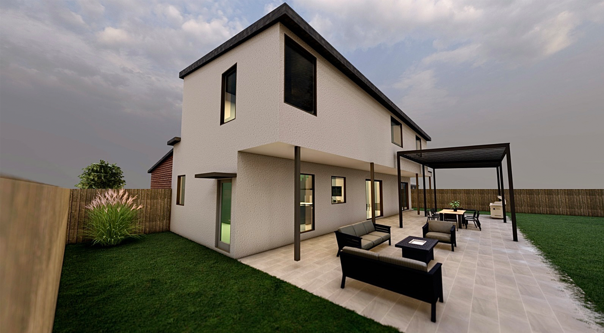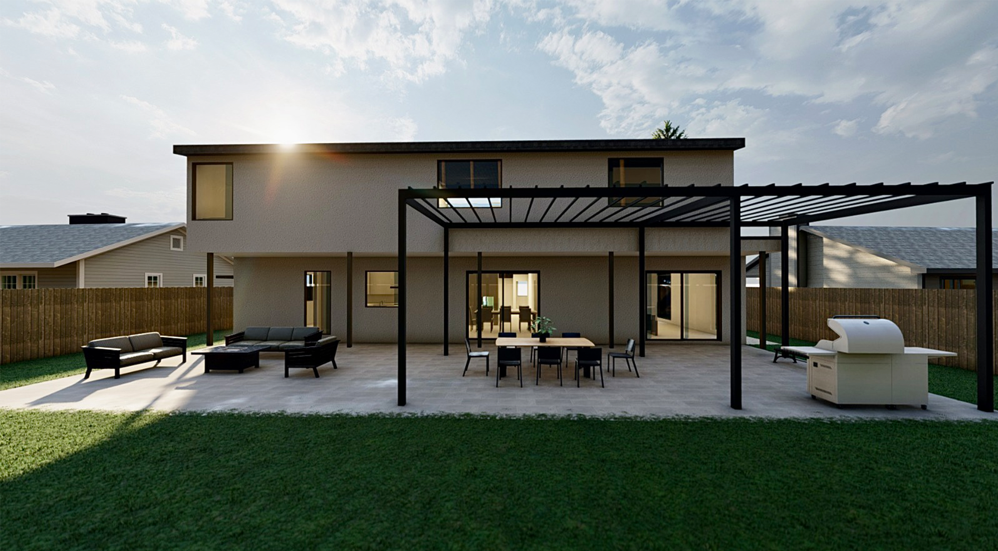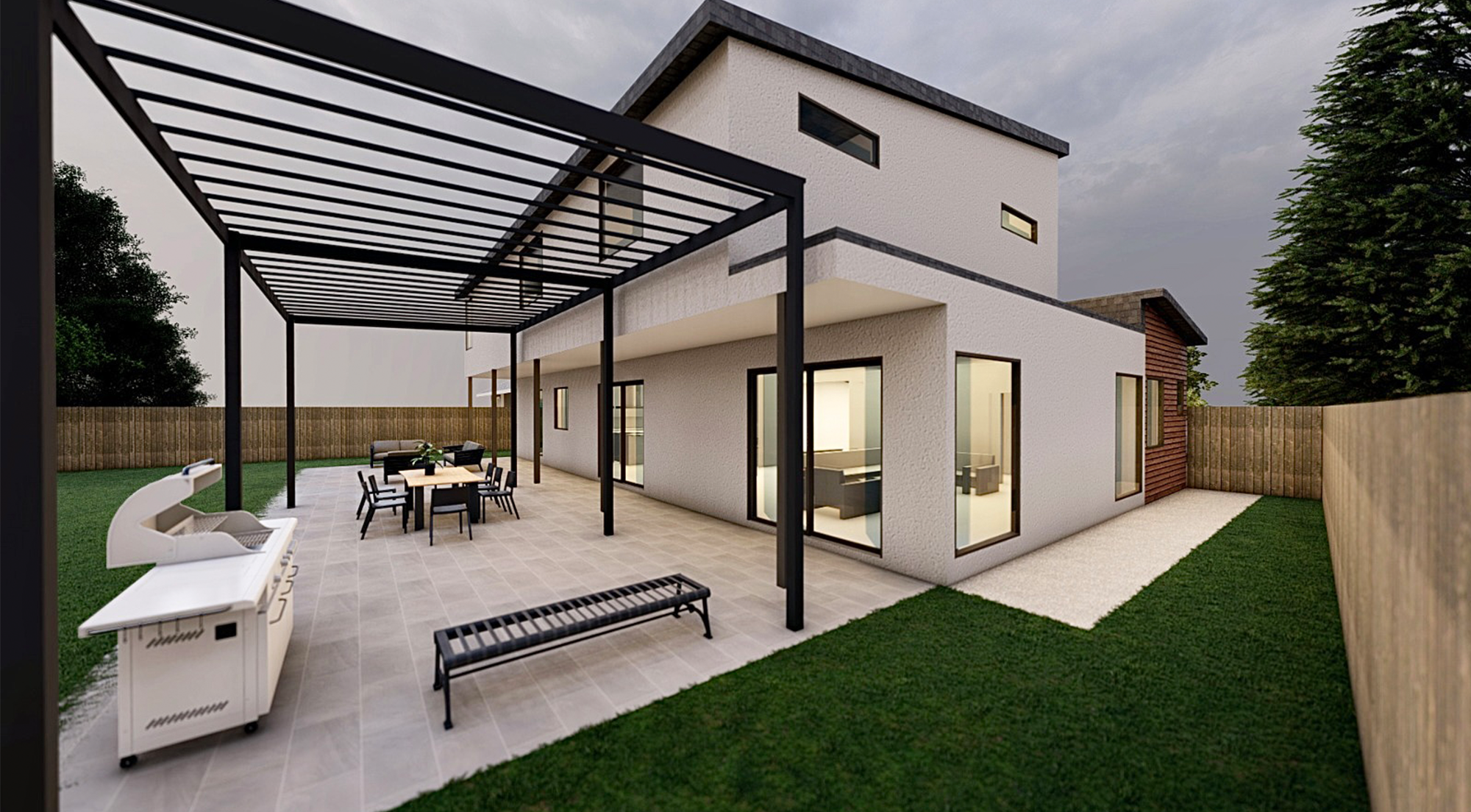 Minimal lines warmed by wood, designed for family living.